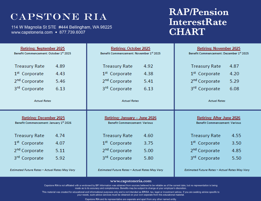 Electing how to take your BP RAP, also known as your pension, is a major decision and requires that you know the facts about how each different option could impact you. Our team strategically plans and monitors interest rates, forecasting future rates and helps advise you as to when the most optimal time to elect for your pension would be.